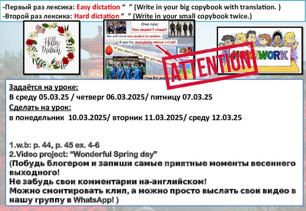 - Первый раз лексика : Easy dictation “ ” (Write in your big copybook with translation. ) -Второй раз лексика : Hard dictation “ ” (Write in your small copybook twice. ) Задаётся на уроке : В среду 05.0 3.25 / четверг 06.0 3.2025/ пятницу 07.0 3.25 Сделать на урок: в понедельник 10. 03.202 5 / вторник 11. 03.202 5 / среду 12. 03.2 5 1.w.b: p. 44, p. 45 ex. 4-6 2.Video project: “Wonderful Spring day” (Побудь блогером и запиши самые приятные моменты весеннего выходного! Не забудь свои комментарии на-английском! Можно смонтировать клип, а можно просто выслать свои видео в нашу группу в WhatsApp ! )