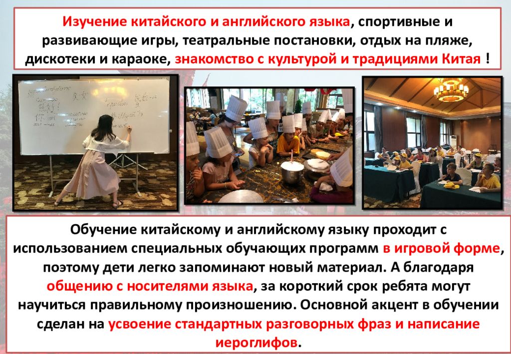 Изучение китайского и английского языка, спортивные и развивающие игры, театральные постановки, отдых на пляже, дискотеки и караоке, знакомство с культурой и традициями Китая ! Обучение китайскому и английскому языку проходит с использованием специальных обучающих программ в игровой форме, поэтому дети легко запоминают новый материал. А благодаря общению с носителями языка, за короткий срок ребята могут научиться правильному произношению. Основной акцент в обучении сделан на усвоение стандартных разговорных фраз и написание иероглифов.