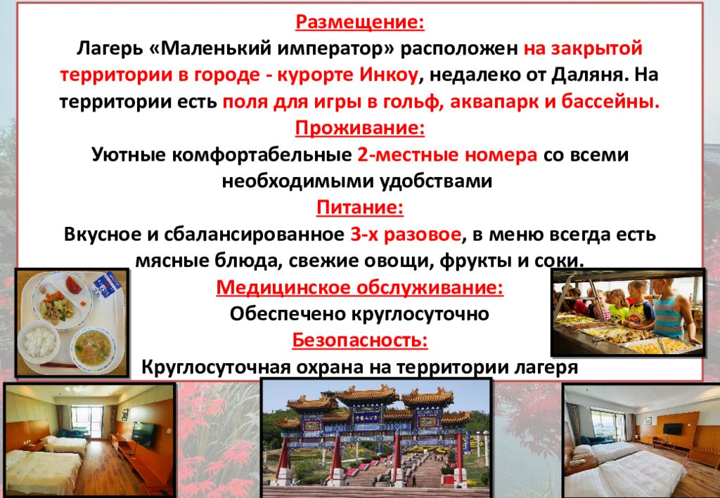Размещение: Лагерь «Маленький император» расположен на закрытой территории в городе - курорте Инкоу, недалеко от Даляня. На территории есть поля для игры в гольф, аквапарк и бассейны. Проживание: Уютные комфортабельные 2-местные номера со всеми необходимыми удобствами Питание: Вкусное и сбалансированное 3-х разовое, в меню всегда есть мясные блюда, свежие овощи, фрукты и соки. Медицинское обслуживание: Обеспечено круглосуточно Безопасность: Круглосуточная охрана на территории лагеря