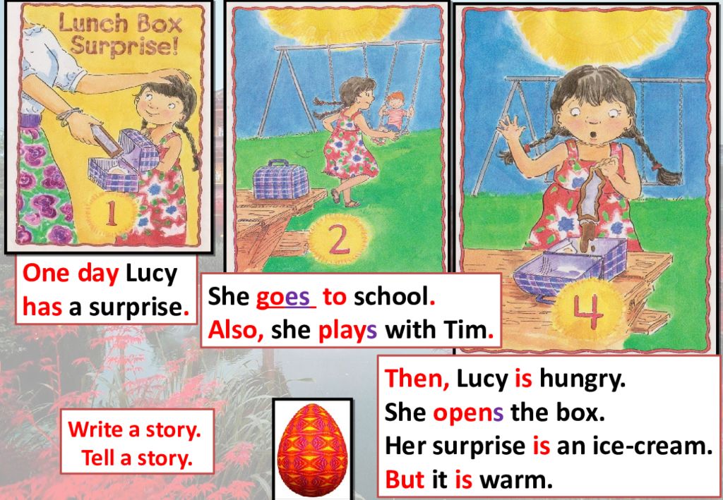 Write a story. Tell a story. One day Lucy has a surprise. Then, Lucy is hungry. She open s the box. Her surprise is an ice-cream. But it is warm. She go es to school. Also, she play s with Tim.