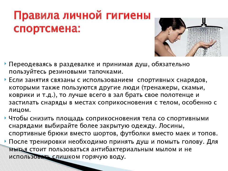 Переодеваясь в раздевалке и принимая душ, обязательно пользуйтесь резиновыми тапочками. Если занятия связаны с использованием спортивных снарядов, которыми также пользуются другие люди (тренажеры, скамьи, коврики и т.д.), то лучше всего в зал брать свое полотенце и застилать снаряды в местах соприкосновения с телом, особенно с лицом. Чтобы снизить площадь соприкосновения тела со спортивными снарядами выбирайте более закрытую одежду. Лосины, спортивные брюки вместо шортов, футболки вместо маек и топов. После тренировки необходимо принять душ и помыть голову. Для мытья стоит пользоваться антибактериальным мылом и не использовать слишком горячую воду. Правила личной гигиены спортсмена: