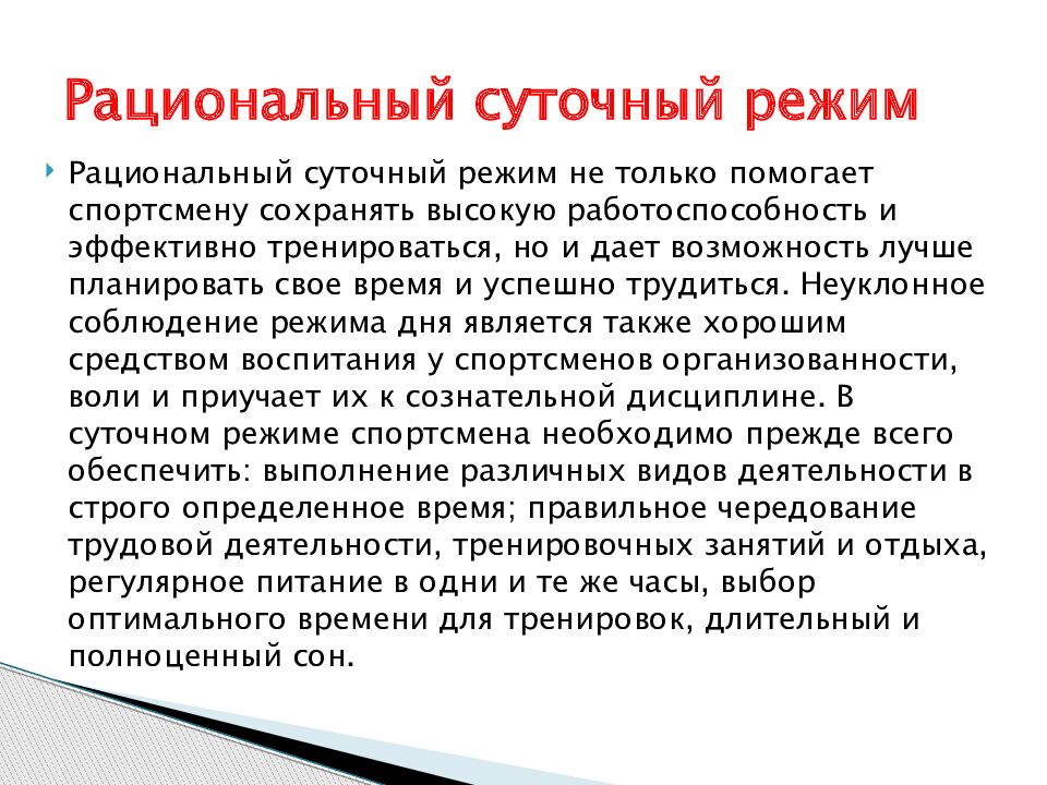не только помогает спортсмену сохранять высокую работоспособность и эффективно тренироваться, но и дает возможность лучше планировать свое время и успешно трудиться. Неуклонное соблюдение режима дня является также хорошим средством воспитания у спортсменов организованности, воли и приучает их к сознательной дисциплине. В суточном режиме спортсмена необходимо прежде всего обеспечить: выполнение различных видов деятельности в строго определенное время; правильное чередование трудовой деятельности, тренировочных занятий и отдыха, регулярное питание в одни и те же часы, выбор оптимального времени для тренировок, длительный и полноценный сон. Рациональный суточный режим