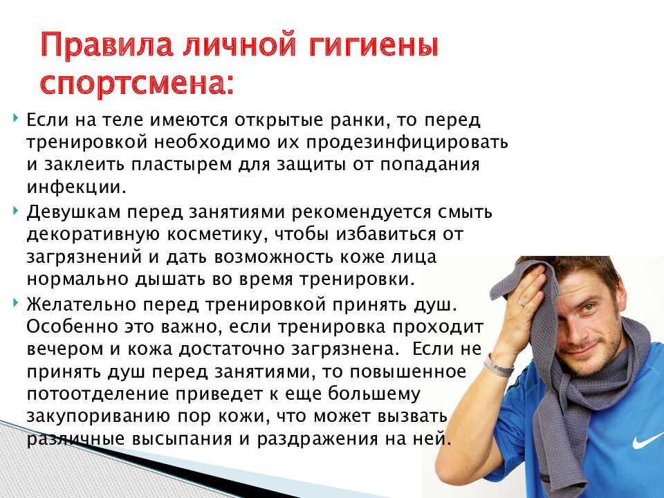 Если на теле имеются открытые ранки, то перед тренировкой необходимо их продезинфицировать и заклеить пластырем для защиты от попадания инфекции. Девушкам перед занятиями рекомендуется смыть декоративную косметику, чтобы избавиться от загрязнений и дать возможность коже лица нормально дышать во время тренировки. Желательно перед тренировкой принять душ. Особенно это важно, если тренировка проходит вечером и кожа достаточно загрязнена. Если не принять душ перед занятиями, то повышенное потоотделение приведет к еще большему закупориванию пор кожи, что может вызвать различные высыпания и раздражения на ней. Правила личной гигиены спортсмена: