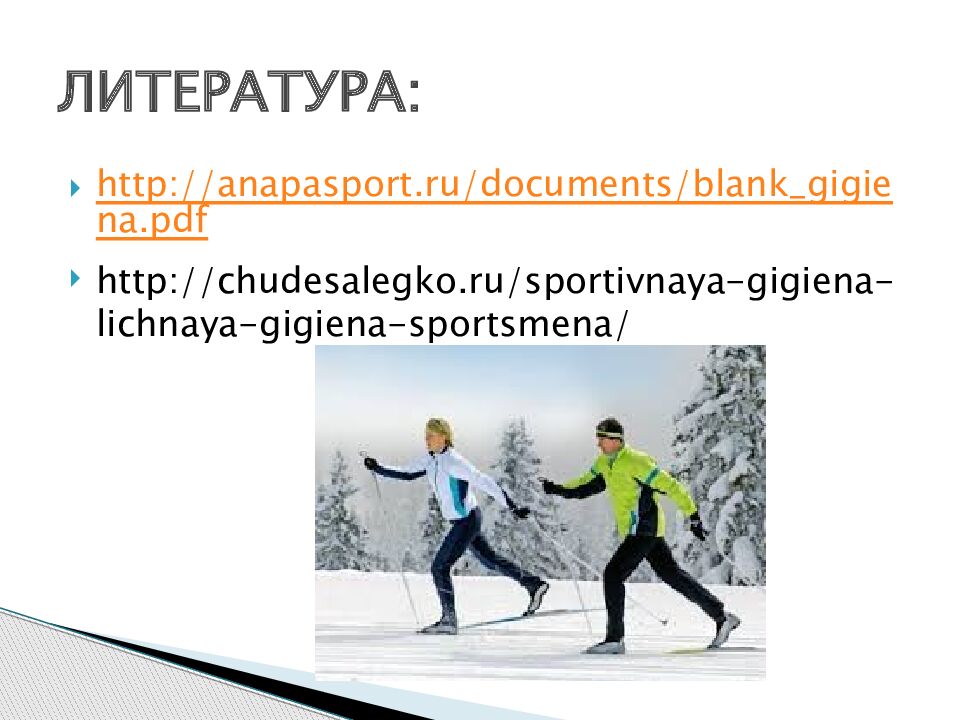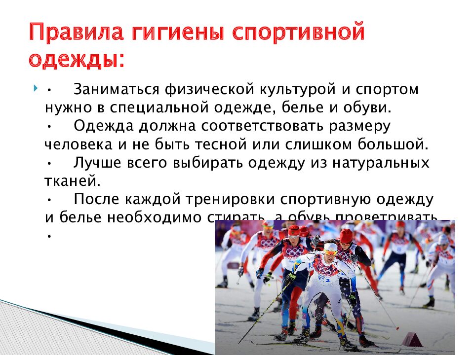 • Заниматься физической культурой и спортом нужно в специальной одежде, белье и обуви. • Одежда должна соответствовать размеру человека и не быть тесной или слишком большой. • Лучше всего выбирать одежду из натуральных тканей. • После каждой тренировки спортивную одежду и белье необходимо стирать, а обувь проветривать. • Правила гигиены спортивной одежды: