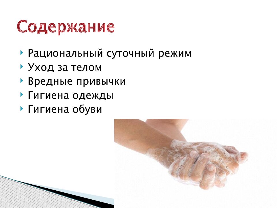 Рациональный суточный режим Уход за телом Вредные привычки Гигиена одежды Гигиена обуви Содержание