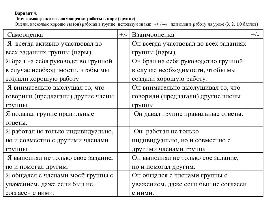 Самооценка +/- Взаимооценка +/- Я всегда активно участвовал во всех заданиях группы (пары). Он всегда участвовал во всех заданиях группы (пары). Я брал на себя руководство группой в случае необходимости, чтобы мы создали хорошую работу Он брал на себя руководство группой в случае необходимости, чтобы мы создали хорошую работу. Я внимательно выслушал то, что говорили (предлагали) другие члены группы. Он внимательно выслушивал то, что говорили (предлагали) другие члены группы Я подавал группе правильные ответы. Он давал группе правильные ответы. Я работал не только индивидуально, но и совместно с другими членами группы. Он работал не только индивидуально, но и совместно с другими членами группы. Я выполнял не только свое задание, но и помогал другим. Он выполнял не только сое задание, но и помогал другим. Я общался с членами моей группы с уважением, даже если был не согласен с ними. Он общался с членами группы с уважением, даже если был не согласен с ними. Вариант 4. Лист самооценки и взаимооценки работы в паре (группе) Оцени, насколько хорошо ты (он) работал в группе: используй знаки: « + / –« или оцени работу на уроке (3, 2, 1,0 баллов)
