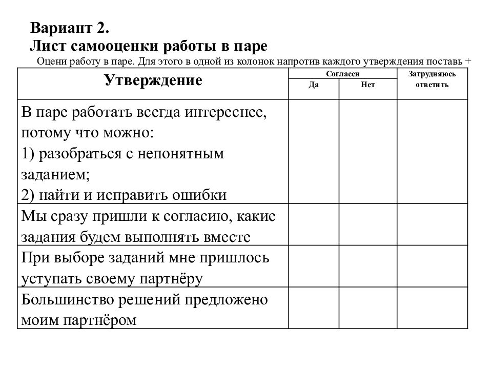 Утверждение Согласен Затрудняюсь ответить Да Нет В паре работать всегда интереснее, потому что можно: 1) разобраться с непонятным заданием; 2) найти и исправить ошибки Мы сразу пришли к согласию, какие задания будем выполнять вместе При выборе заданий мне пришлось уступать своему партнёру Большинство решений предложено моим партнёром Оцени работу в паре. Для этого в одной из колонок напротив каждого утверждения поставь +