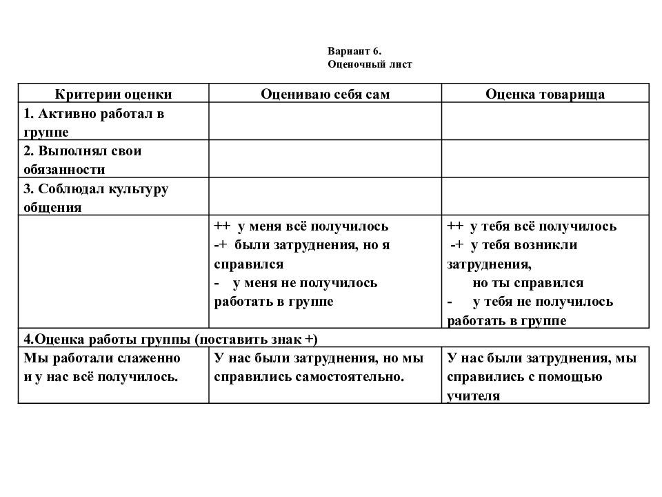 Критерии оценки Оцениваю себя сам Оценка товарища 1. Активно работал в группе 2. Выполнял свои обязанности 3. Соблюдал культуру общения ++ у меня всё получилось -+ были затруднения, но я справился - у меня не получилось работать в группе ++ у тебя всё получилось -+ у тебя возникли затруднения, но ты справился - у тебя не получилось работать в группе 4.Оценка работы группы (поставить знак +) Мы работали слаженно и у нас всё получилось. У нас были затруднения, но мы справились самостоятельно. У нас были затруднения, мы справились с помощью учителя Вариант 6. Оценочный лист