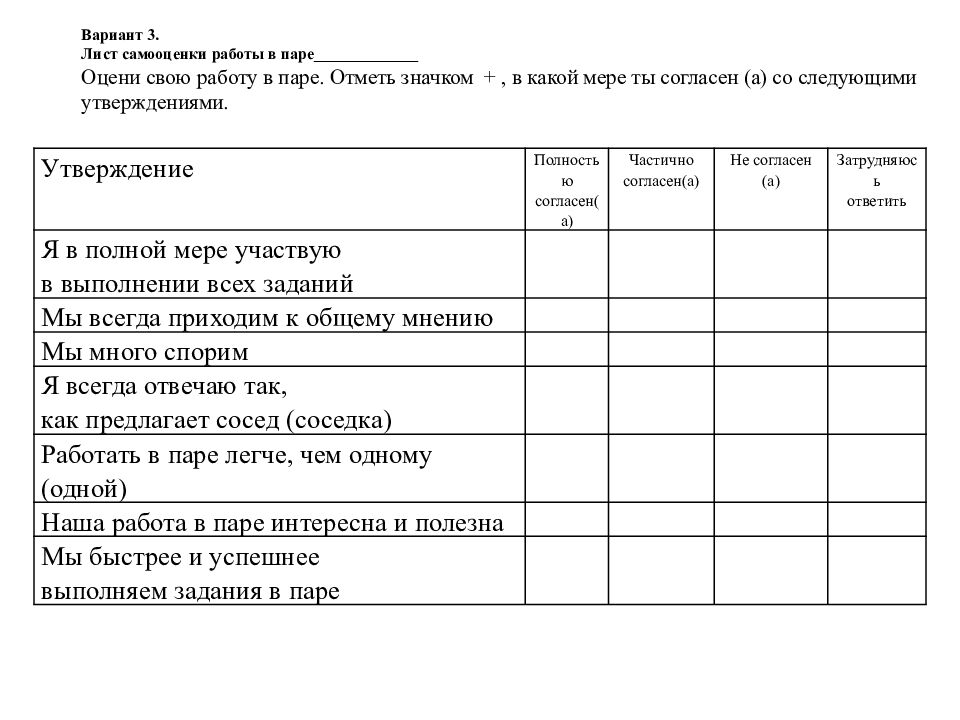 Утверждение Полностью согласен(а) Частично согласен(а) Не согласен (а) Затрудняюсь ответить Я в полной мере участвую в выполнении всех заданий Мы всегда приходим к общему мнению Мы много спорим Я всегда отвечаю так, как предлагает сосед (соседка) Работать в паре легче, чем одному (одной) Наша работа в паре интересна и полезна Мы быстрее и успешнее выполняем задания в паре Вариант 3. Лист самооценки работы в паре_____________ Оцени свою работу в паре. Отметь значком +, в какой мере ты согласен (а) со следующими утверждениями.