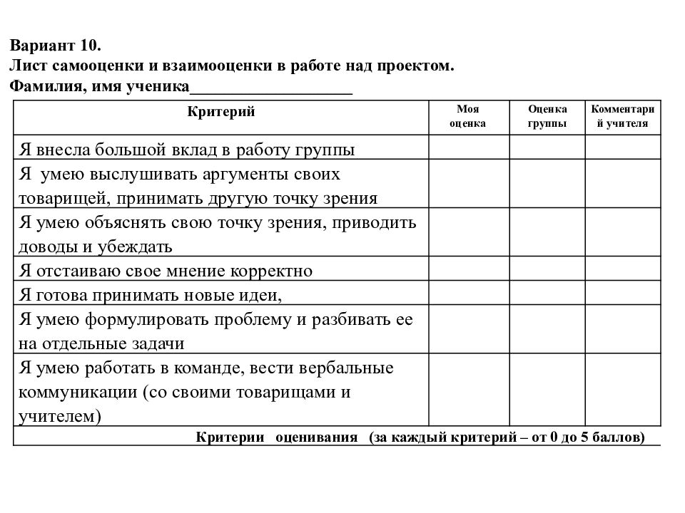 Критерий Моя оценка Оценка группы Комментарий учителя Я внесла большой вклад в работу группы Я умею выслушивать аргументы своих товарищей, принимать другую точку зрения Я умею объяснять свою точку зрения, приводить доводы и убеждать Я отстаиваю свое мнение корректно Я готова принимать новые идеи, Я умею формулировать проблему и разбивать ее на отдельные задачи Я умею работать в команде, вести вербальные коммуникации (со своими товарищами и учителем) Критерии оценивания (за каждый критерий – от 0 до 5 баллов) Вариант 10. Лист самооценки и взаимооценки в работе над проектом. Фамилия, имя ученика___________________