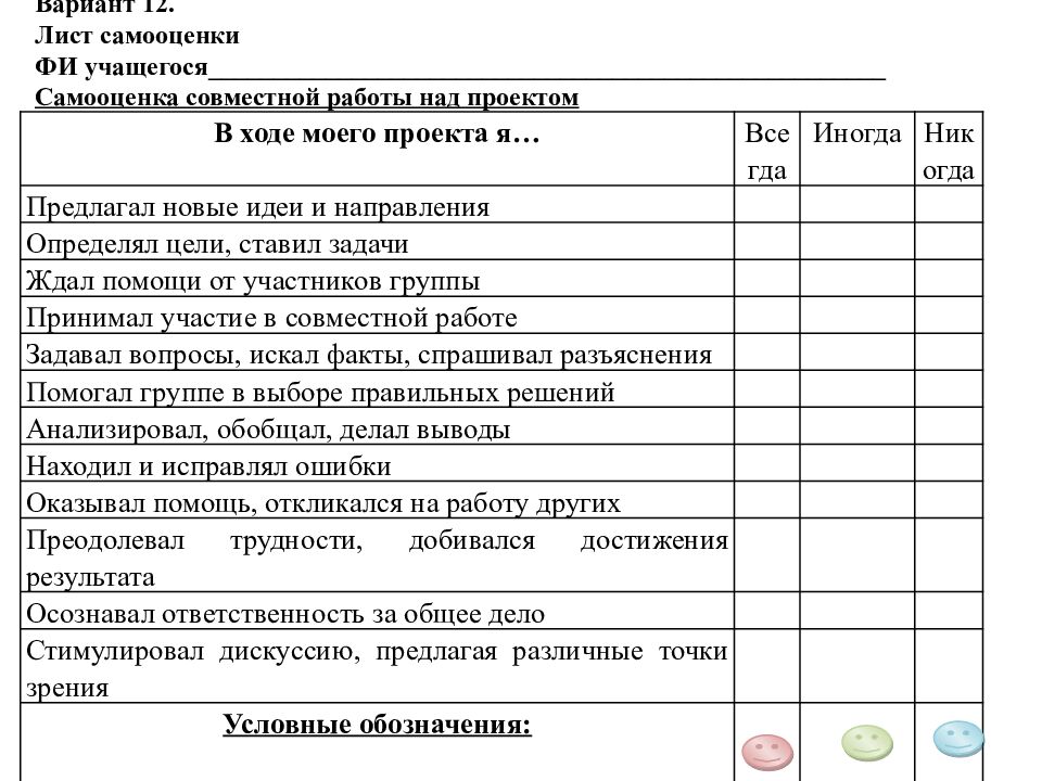 В ходе моего проекта я… Всегда Иногда Никогда Предлагал новые идеи и направления Определял цели, ставил задачи Ждал помощи от участников группы Принимал участие в совместной работе Задавал вопросы, искал факты, спрашивал разъяснения Помогал группе в выборе правильных решений Анализировал, обобщал, делал выводы Находил и исправлял ошибки Оказывал помощь, откликался на работу других Преодолевал трудности, добивался достижения результата Осознавал ответственность за общее дело Стимулировал дискуссию, предлагая различные точки зрения Условные обозначения: Вариант 12. Лист самооценки ФИ учащегося____________________________________________________ Самооценка совместной работы над проектом