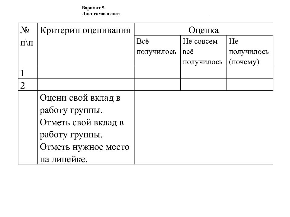 № п\п Критерии оценивания Оценка Всё получилось Не совсем всё получилось Не получилось (почему) 1 2 Оцени свой вклад в работу группы. Отметь свой вклад в работу группы. Отметь нужное место на линейке. Вариант 5. Лист самооценки ____________________________________