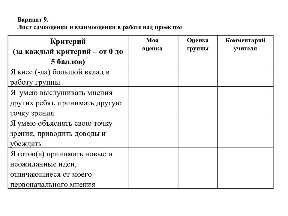 Критерий (за каждый критерий – от 0 до 5 баллов) Моя оценка Оценка группы Комментарий учителя Я внес (-ла) большой вклад в работу группы Я умею выслушивать мнения других ребят, принимать другую точку зрения Я умею объяснять свою точку зрения, приводить доводы и убеждать Я готов(а) принимать новые и неожиданные идеи, отличающиеся от моего первоначального мнения Вариант 9. Лист самооценки и взаимооценки в работе над проектом