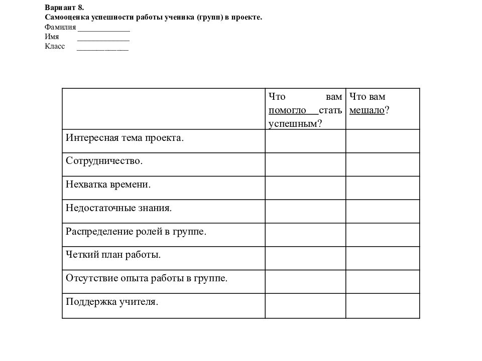 Что вам помогло стать успешным? Что вам мешало ? Интересная тема проекта. Сотрудничество. Нехватка времени. Недостаточные знания. Распределение ролей в группе. Четкий план работы. Отсутствие опыта работы в группе. Поддержка учителя. Вариант 8. Самооценка успешности работы ученика (групп) в проекте. Фамилия _____________ Имя _____________ Класс _____________