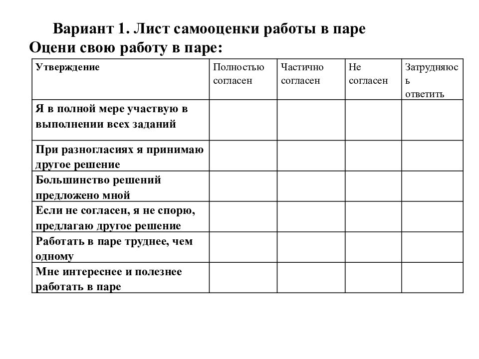 Слайд 3: Вариант 2. Лист самооценки работы в паре