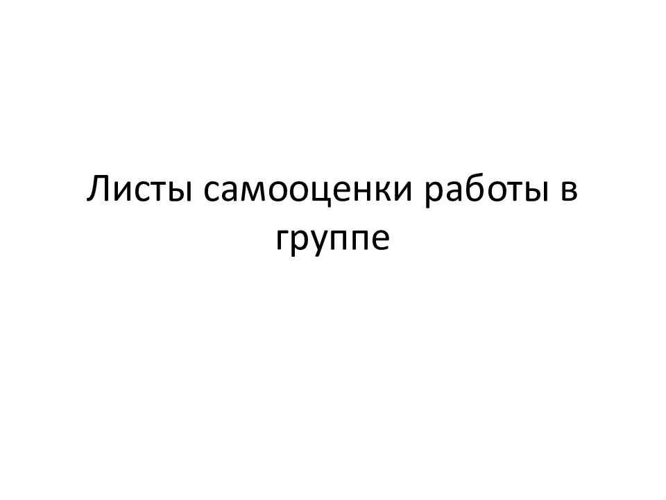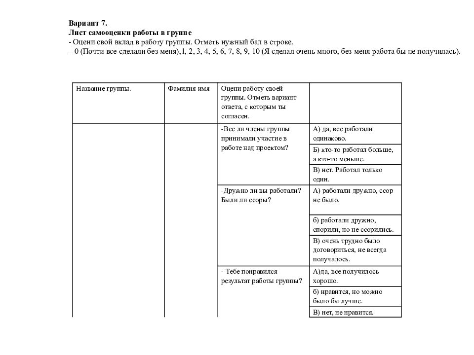 Название группы. Фамилия имя Оцени работу своей группы. Отметь вариант ответа, с которым ты согласен. -Все ли члены группы принимали участие в работе над проектом? А) да, все работали одинаково. Б) кто-то работал больше, а кто-то меньше. В) нет. Работал только один. -Дружно ли вы работали? Были ли ссоры? А) работали дружно, ссор не было. б) работали дружно, спорили, но не ссорились. В) очень трудно было договориться, не всегда получалось. - Тебе понравился результат работы группы? А)да, все получилось хорошо. б) нравится, но можно было бы лучше. В) нет, не нравится. Вариант 7. Лист самооценки работы в группе - Оцени свой вклад в работу группы. Отметь нужный бал в строке. – 0 (Почти все сделали без меня),1, 2, 3, 4, 5, 6, 7, 8, 9, 10 (Я сделал очень много, без меня работа бы не получилась).