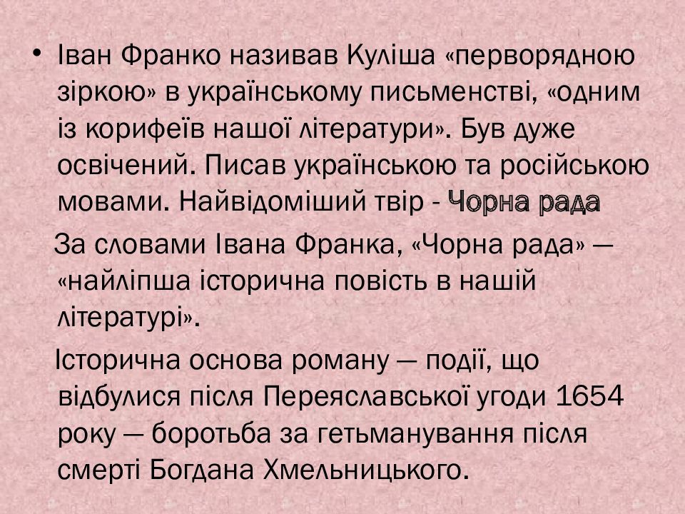 Іван Франко називав Куліша « перворядною зіркою » в українському письменстві, «одним із корифеїв нашої літератури ». Був дуже освічений. Писав українською та російською мовами. Найвідоміший твір - Чорна рада За словами Івана Франка, « Чорна рада» — « найліпша історична повість в нашій літературі ». Історична основа роману — події, що відбулися після Переяславської угоди 1654 року — боротьба за гетьманування після смерті Богдана Хмельницького.