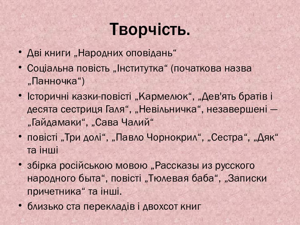 Дві книги „ Народних оповідань “ Соціальна повість „ Інститутка “ ( початкова назва „Панночка“) Історичні казки-повісті „ Кармелюк “, „ Дев'ять братів і десята сестриця Галя“, „ Невільничка “, незавершені — „Гайдамаки“, „Сава Чалий “ повісті „Три долі “, „ Павло Чорнокрил “, „Сестра“, „ Дяк “ та інші збірка російською мовою „Рассказы из русского народного быта“, повісті „Тюлевая баба“, „Записки причетника“ та інші. близько ста перекладів і двохсот книг