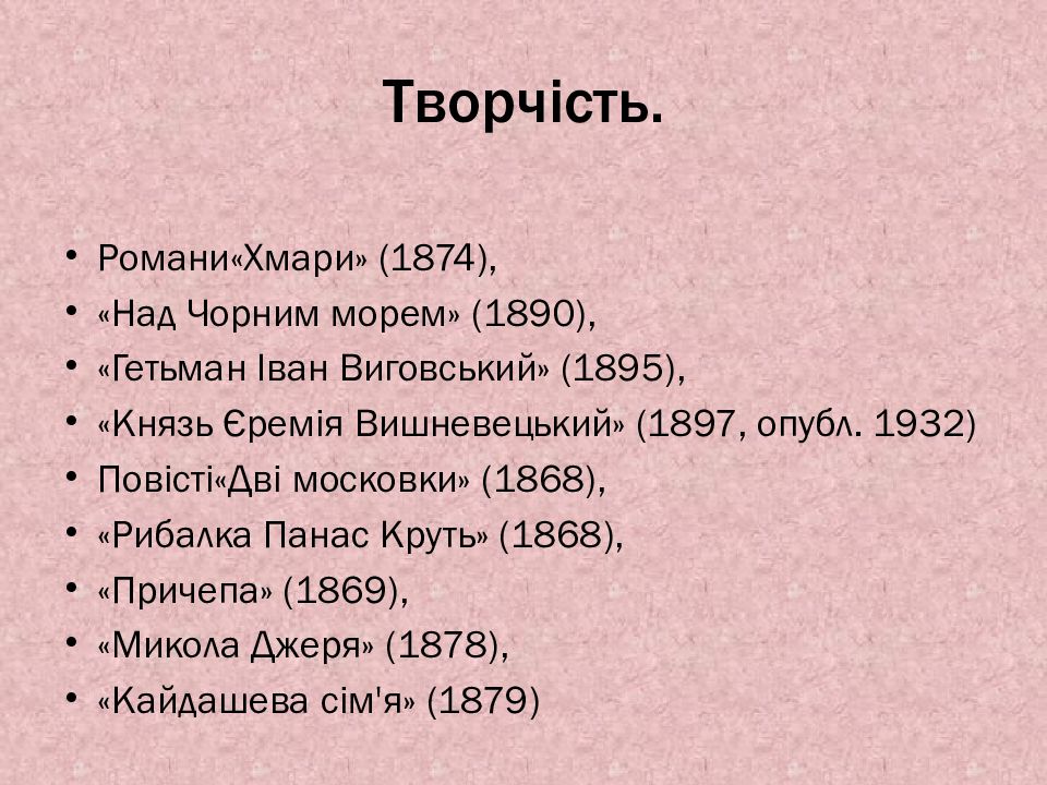 Романи «Хмари» (1874), «Над Чорним морем» (1890), « Гетьман Іван Виговський » (1895), «Князь Єремія Вишневецький » (1897, опубл. 1932) Повісті « Дві московки » (1868), « Рибалка Панас Круть » (1868), « Причепа » (1869), « Микола Джеря » (1878), « Кайдашева сім'я » (1879)