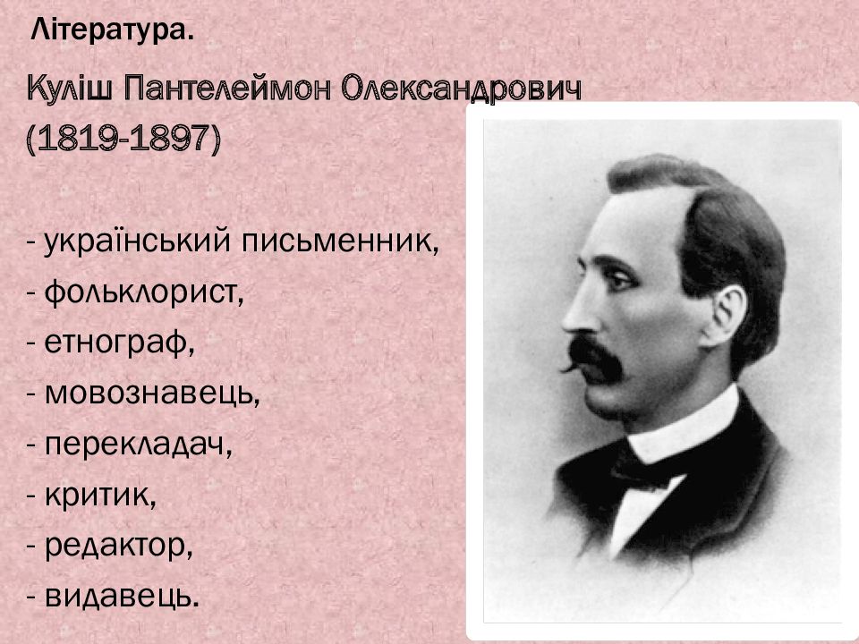 Куліш Пантелеймон Олександрович (1819-1897) - український письменник, - фольклорист, - етнограф, - мовознавець, - перекладач, - критик, - редактор, - видавець.