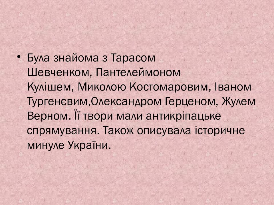 Була знайома з Тарасом Шевченком, Пантелеймоном Кулішем, Миколою Костомаровим, Іваном Тургенєвим,Олександром Герценом, Жулем Верном. Її твори мали антикріпацьке спрямування. Також описувала історичне минуле України.