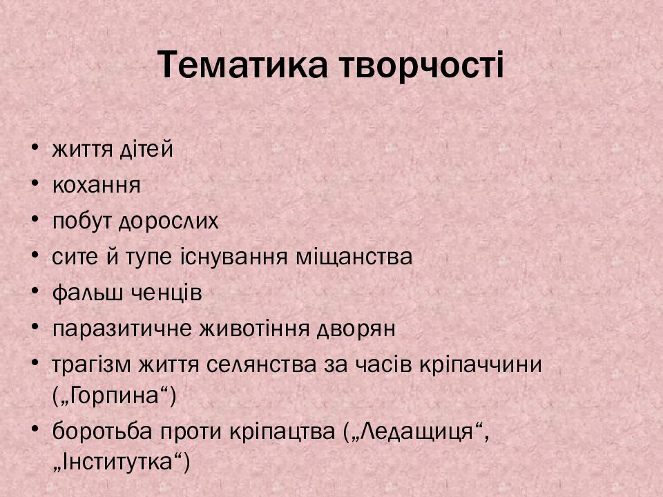 життя дітей кохання побут дорослих сите й тупе існування міщанства фальш ченців паразитичне животіння дворян трагізм життя селянства за часів кріпаччини („ Горпина “) боротьба проти кріпацтва („ Ледащиця “, „ Інститутка “)