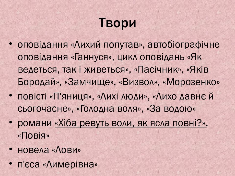 оповідання « Лихий попутав», автобіографічне оповідання « Ганнуся », цикл оповідань «Як ведеться, так і живеться », « Пасічник », « Яків Бородай», « Замчище », « Визвол », « Морозенко » повісті « П'яниця », « Лихі люди», «Лихо давнє й сьогочасне », «Голодна воля», «За водою» романи « Хіба ревуть воли, як ясла повні ?», « Повія » новела «Лови» п'єса « Лимерівна »