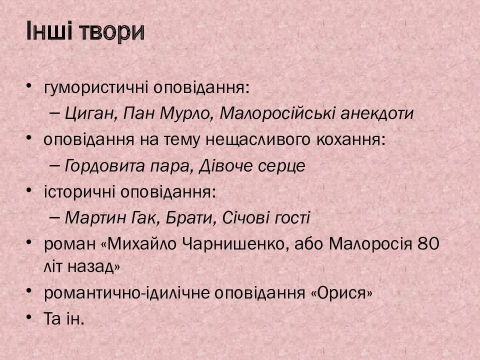 Інші твори гумористичні оповідання : Циган, Пан Мурло, Малоросійські анекдоти оповідання на тему нещасливого кохання : Гордовита пара, Дівоче серце історичні оповідання : Мартин Гак, Брати, Січові гості роман «Михайло Чарнишенко, або Малоросія 80 літ назад» романтично-ідилічне оповідання « Орися » Та ін.