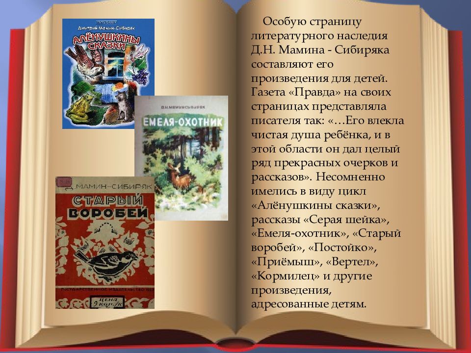 Особую страницу литературного наследия Д.Н. Мамина - Сибиряка составляют его произведения для детей. Газета «Правда» на своих страницах представляла писателя так: «…Его влекла чистая душа ребёнка, и в этой области он дал целый ряд прекрасных очерков и рассказов». Несомненно имелись в виду цикл «Алёнушкины сказки», рассказы «Серая шейка», «Емеля-охотник», «Старый воробей», «Постойко», «Приёмыш», «Вертел», «Кормилец» и другие произведения, адресованные детям.