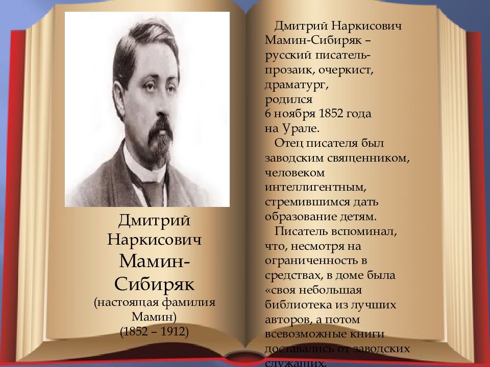 Дмитрий Наркисович Мамин-Сибиряк (настоящая фамилия Мамин) (1852 – 1912) Дмитрий Наркисович Мамин-Сибиряк – русский писатель-прозаик, очеркист, драматург, родился 6 ноября 1852 года на Урале. Отец писателя был заводским священником, человеком интеллигентным, стремившимся дать образование детям. Писатель вспоминал, что, несмотря на ограниченность в средствах, в доме была «своя небольшая библиотека из лучших авторов, а потом всевозможные книги доставались от заводских служащих.