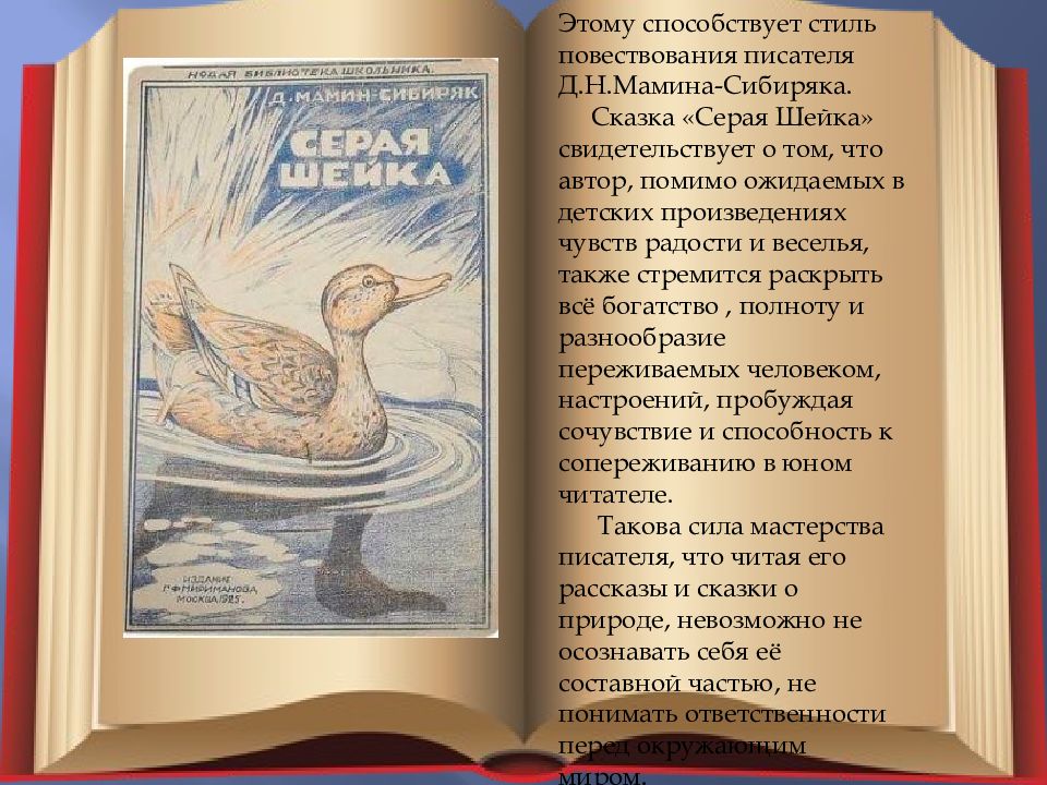 Этому способствует стиль повествования писателя Д.Н.Мамина-Сибиряка. Сказка «Серая Шейка» свидетельствует о том, что автор, помимо ожидаемых в детских произведениях чувств радости и веселья, также стремится раскрыть всё богатство, полноту и разнообразие переживаемых человеком, настроений, пробуждая сочувствие и способность к сопереживанию в юном читателе. Такова сила мастерства писателя, что читая его рассказы и сказки о природе, невозможно не осознавать себя её составной частью, не понимать ответственности перед окружающим миром.
