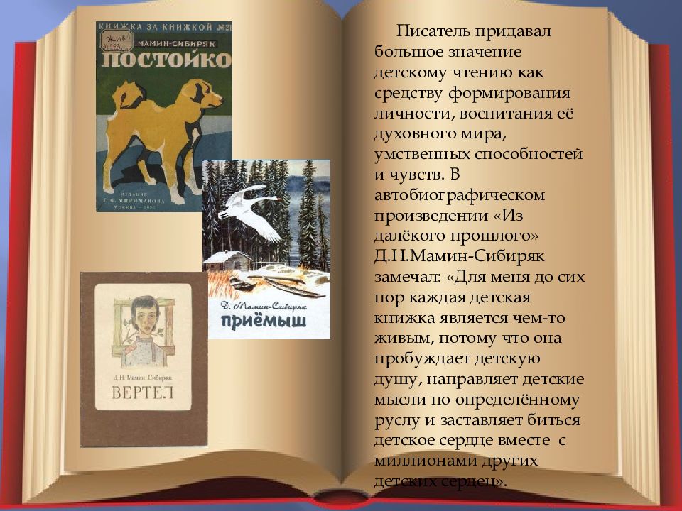 Писатель придавал большое значение детскому чтению как средству формирования личности, воспитания её духовного мира, умственных способностей и чувств. В автобиографическом произведении «Из далёкого прошлого» Д.Н.Мамин-Сибиряк замечал: «Для меня до сих пор каждая детская книжка является чем-то живым, потому что она пробуждает детскую душу, направляет детские мысли по определённому руслу и заставляет биться детское сердце вместе с миллионами других детских сердец».