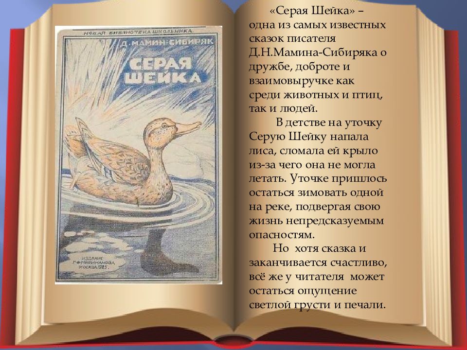 «Серая Шейка» – одна из самых известных сказок писателя Д.Н.Мамина-Сибиряка о дружбе, доброте и взаимовыручке как среди животных и птиц, так и людей. В детстве на уточку Серую Шейку напала лиса, сломала ей крыло из-за чего она не могла летать. Уточке пришлось остаться зимовать одной на реке, подвергая свою жизнь непредсказуемым опасностям. Но хотя сказка и заканчивается счастливо, всё же у читателя может остаться ощущение светлой грусти и печали.