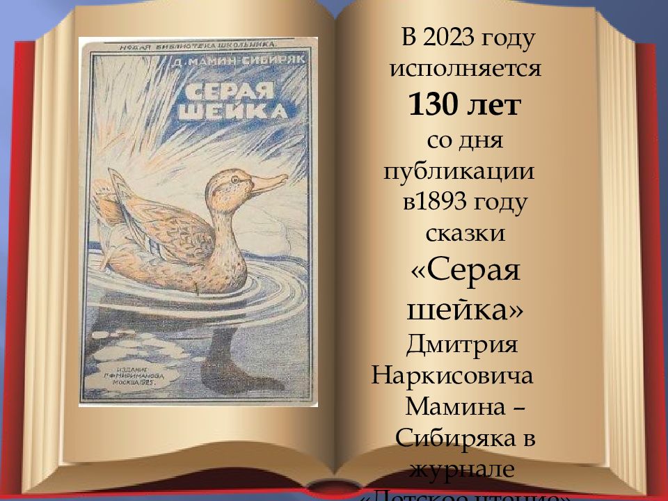 В 2023 году исполняется 130 лет со дня публикации в1893 году сказки «Серая шейка» Дмитрия Наркисовича Мамина – Сибиряка в журнале «Детское чтение»