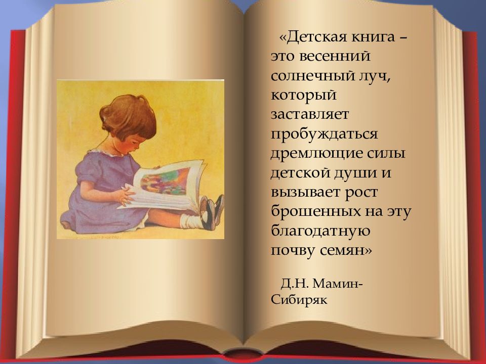 «Детская книга – это весенний солнечный луч, который заставляет пробуждаться дремлющие силы детской души и вызывает рост брошенных на эту благодатную почву семян» Д.Н. Мамин-Сибиряк