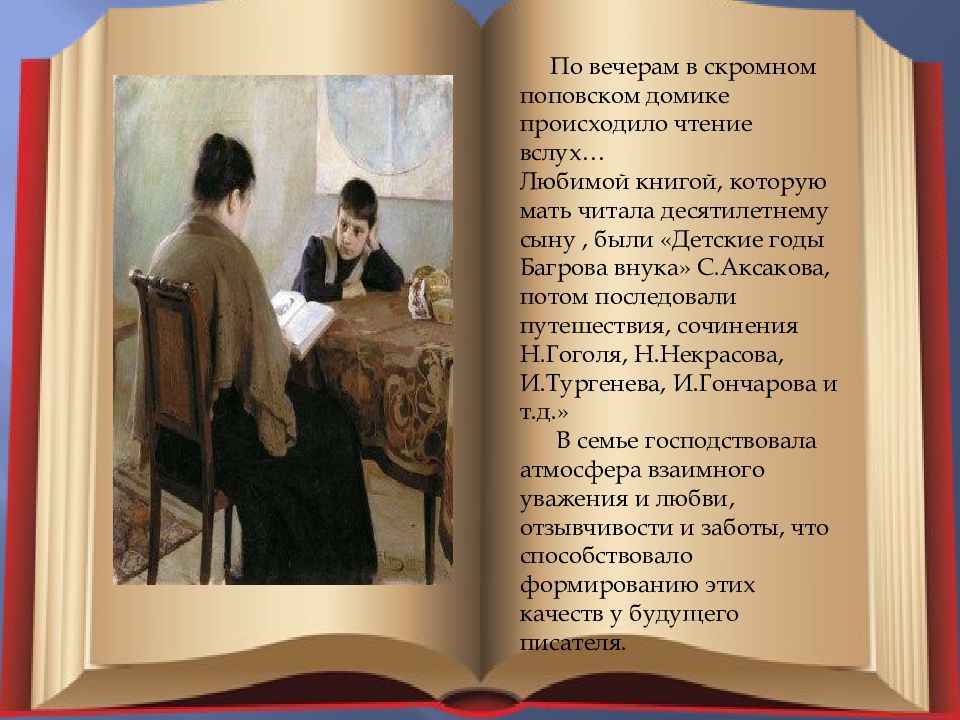 По вечерам в скромном поповском домике происходило чтение вслух… Любимой книгой, которую мать читала десятилетнему сыну, были «Детские годы Багрова внука» С.Аксакова, потом последовали путешествия, сочинения Н.Гоголя, Н.Некрасова, И.Тургенева, И.Гончарова и т.д.» В семье господствовала атмосфера взаимного уважения и любви, отзывчивости и заботы, что способствовало формированию этих качеств у будущего писателя.
