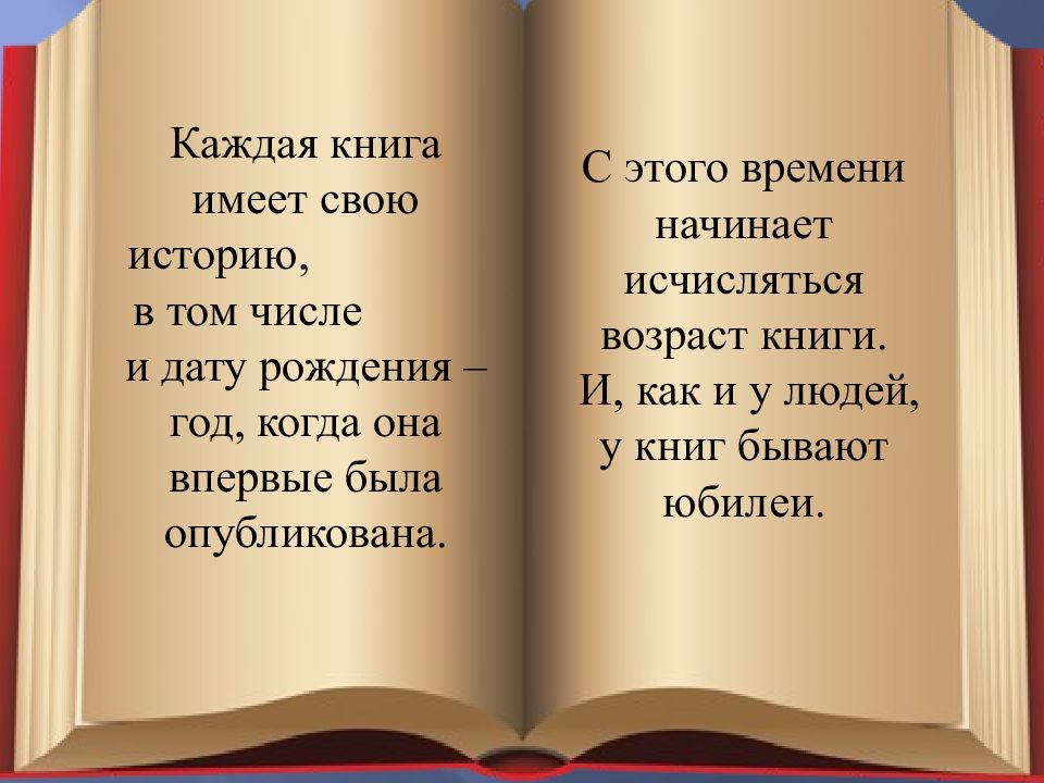 С этого времени начинает исчисляться возраст книги. И, как и у людей, у книг бывают юбилеи. Каждая книга имеет свою историю, в том числе и дату рождения – год, когда она впервые была опубликована.