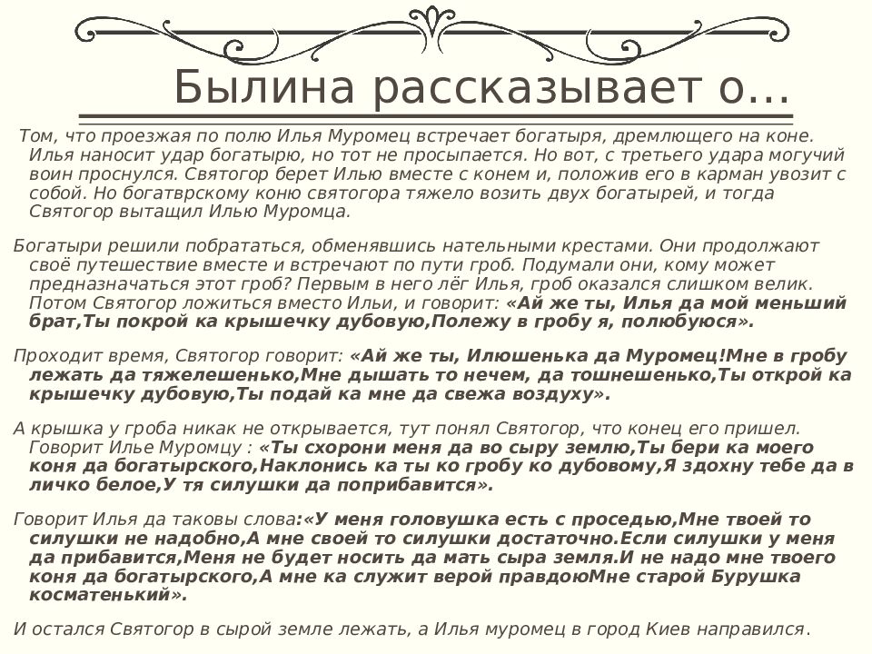 Том, что проезжая по полю Илья Муромец встречает богатыря, дремлющего на коне. Илья наносит удар богатырю, но тот не просыпается. Но вот, с третьего удара могучий воин проснулся. Святогор берет Илью вместе с конем и, положив его в карман увозит с собой. Но богатврскому коню святогора тяжело возить двух богатырей, и тогда Святогор вытащил Илью Муромца. Богатыри решили побрататься, обменявшись нательными крестами. Они продолжают своё путешествие вместе и встречают по пути гроб. Подумали они, кому может предназначаться этот гроб? Первым в него лёг Илья, гроб оказался слишком велик. Потом Святогор ложиться вместо Ильи, и говорит: «Ай же ты, Илья да мой меньший брат,Ты покрой ка крышечку дубовую,Полежу в гробу я, полюбуюся ». Проходит время, Святогор говорит: «Ай же ты, Илюшенька да Муромец!Мне в гробу лежать да тяжелешенько,Мне дышать то нечем, да тошнешенько,Ты открой ка крышечку дубовую,Ты подай ка мне да свежа воздуху». А крышка у гроба никак не открывается, тут понял Святогор, что конец его пришел. Говорит Илье Муромцу : «Ты схорони меня да во сыру землю,Ты бери ка моего коня да богатырского,Наклонись ка ты ко гробу ко дубовому,Я здохну тебе да в личко белое,У тя силушки да поприбавится ». Говорит Илья да таковы слова :«У меня головушка есть с проседью,Мне твоей то силушки не надобно,А мне своей то силушки достаточно.Если силушки у меня да прибавится,Меня не будет носить да мать сыра земля.И не надо мне твоего коня да богатырского,А мне ка служит верой правдоюМне старой Бурушка косматенький ». И остался Святогор в сырой земле лежать, а Илья муромец в город Киев направился.