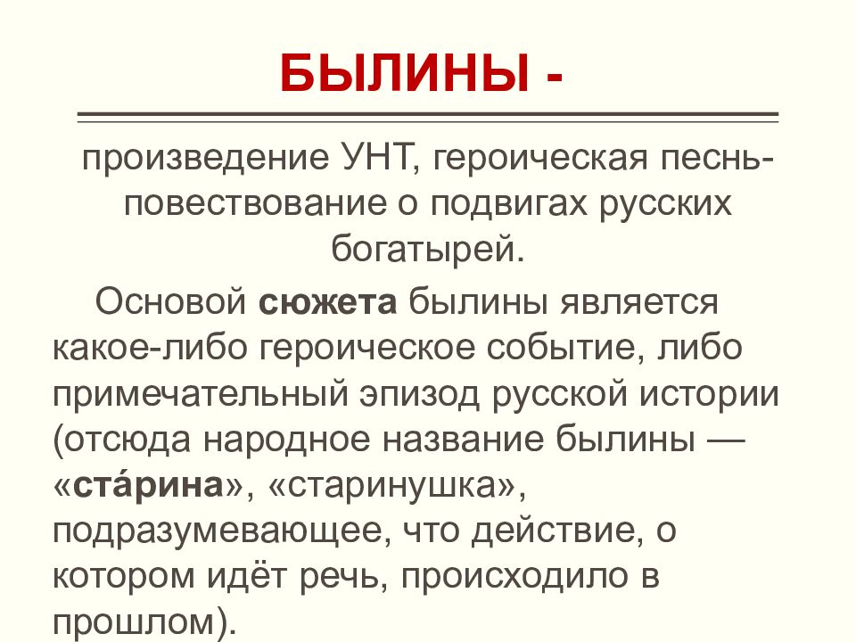 произведение УНТ, героическая песнь-повествование о подвигах русских богатырей. Основой сюжета былины является какое-либо героическое событие, либо примечательный эпизод русской истории ( отсюда народное название былины — « ста́рина », « старинушка », подразумевающее, что действие, о котором идёт речь, происходило в прошлом ).