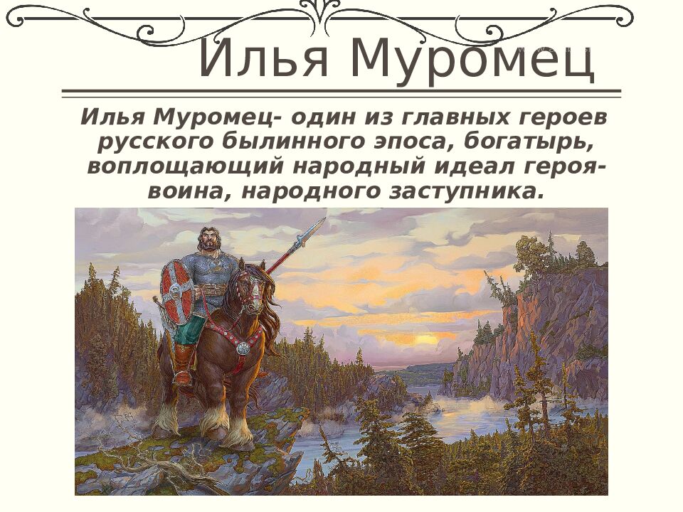 Илья Муромец- один из главных героев русского былинного эпоса, богатырь, воплощающий народный идеал героя-воина, народного заступника.