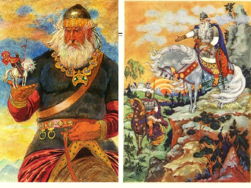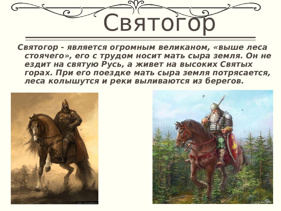 Святогор - является огромным великаном, «выше леса стоячего», его с трудом носит мать сыра земля. Он не ездит на святую Русь, а живет на высоких Святых горах. При его поездке мать сыра земля потрясается, леса колышутся и реки выливаются из берегов.