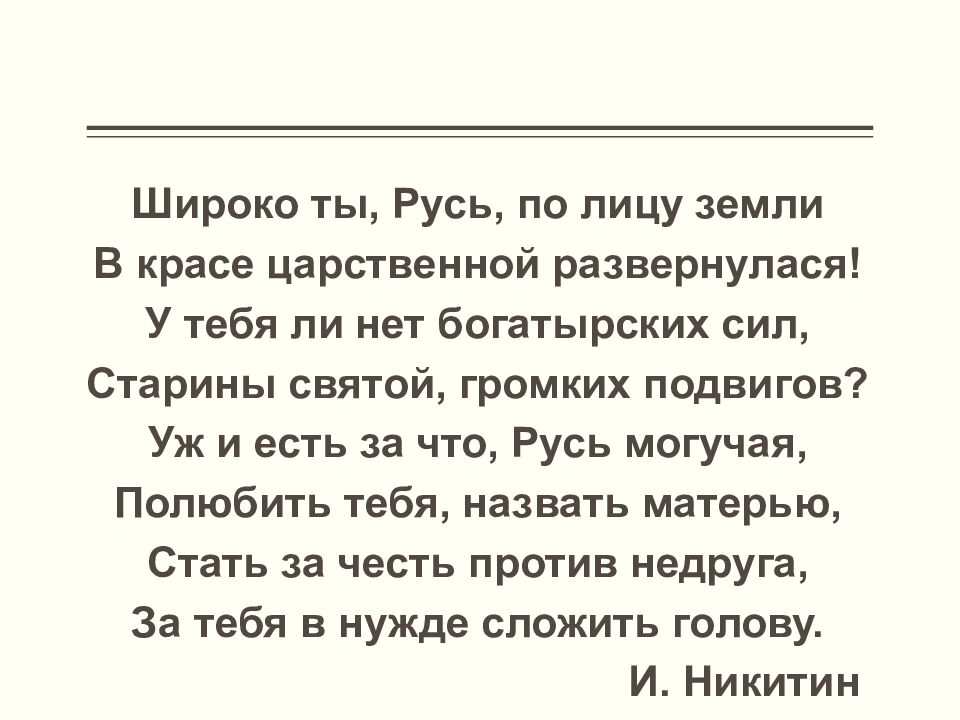 Широко ты, Русь, по лицу земли В красе царственной развернулася ! У тебя ли нет богатырских сил, Старины святой, громких подвигов ? Уж и есть за что, Русь могучая, Полюбить тебя, назвать матерью, Стать за честь против недруга, За тебя в нужде сложить голову. И. Никитин