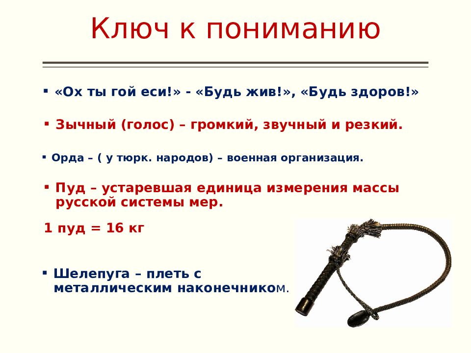 «Ох ты гой еси !» - «Будь жив!», «Будь здоров!» Зычный (голос) – громкий, звучный и резкий. Шелепуга – плеть с металлическим наконечнико м. Пуд – устаревшая единица измерения массы русской системы мер. 1 пуд = 16 кг Орда – ( у тюрк. народов) – военная организация.