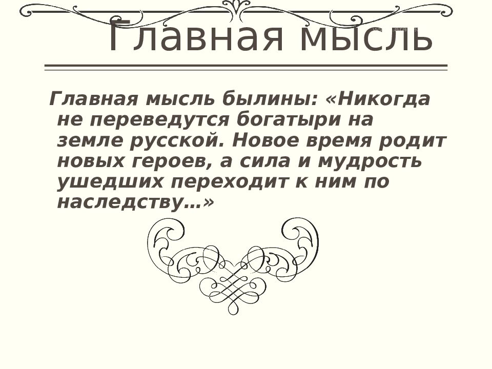 Главная мысль былины: «Никогда не переведутся богатыри на земле русской. Новое время родит новых героев, а сила и мудрость ушедших переходит к ним по наследству…»