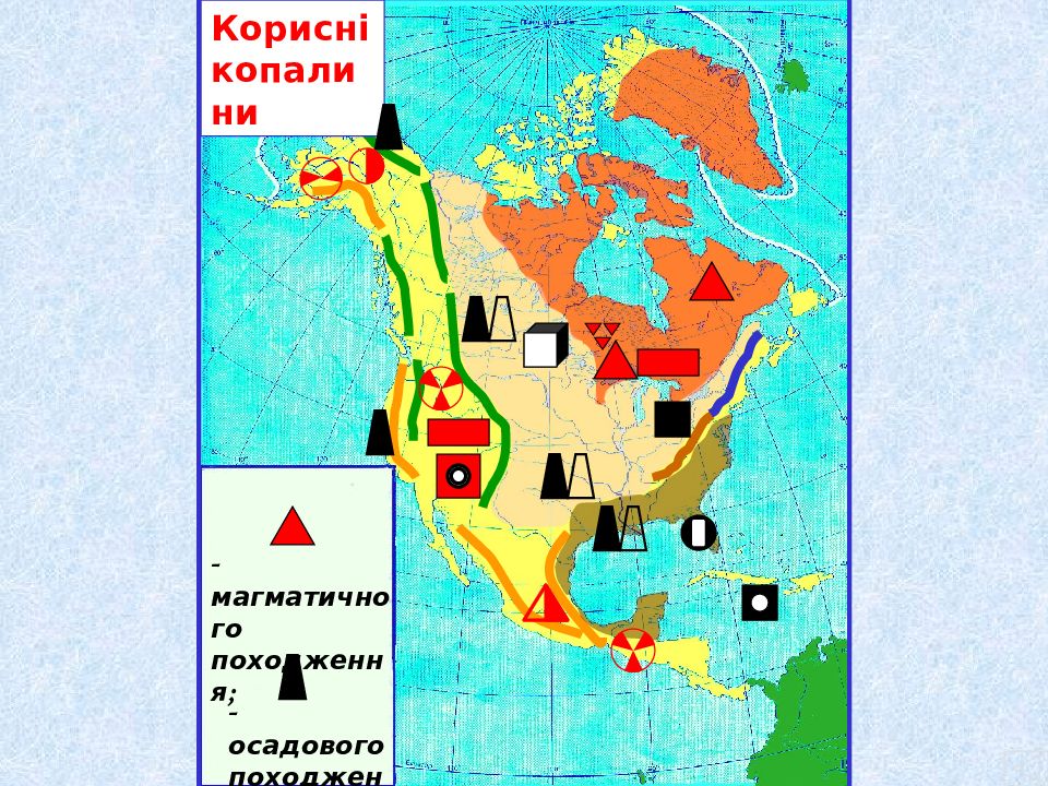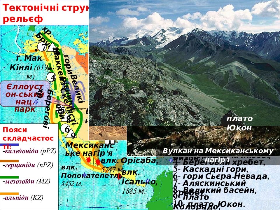 Центральні рівнини Великі рівнини Лаврентійська височина 1 2 3 Аппалачі г. Мак- Кінлі (6193 м) хр. Брукса Мексиканське нагір'я влк. Ісалько, 1885 м. влк. Орісаба, 5747 м. влк. Попокатепетль, 5452 м. 4 5 6 7 1 - Примексиканська низов., 2 - Приатлантична низов., 3 - Флоридська низов., 4 - Береговий хребет, 5 - Каскадні гори, 6 - гори Сьєра-Невада, 8 8 - Великий басейн, 9 - плато Колорадо, 10 - плато Юкон. 9 10 Скелясті гори Єллоустон-ський нац. парк г. Мітчелл (2037 м) - герциніди (п PZ) - альпіди (KZ) - каледоніди (р PZ ) 7 - Аляскинський хребет, - мезозоїди (MZ) Пояси складчастості: Берегові хр. Мексиканське нагір'я Плато Колорадо Тектонічні структури, рельєф Вулкан на Мексиканському нагір'ї гори Маккензі плато Юкон F F F F