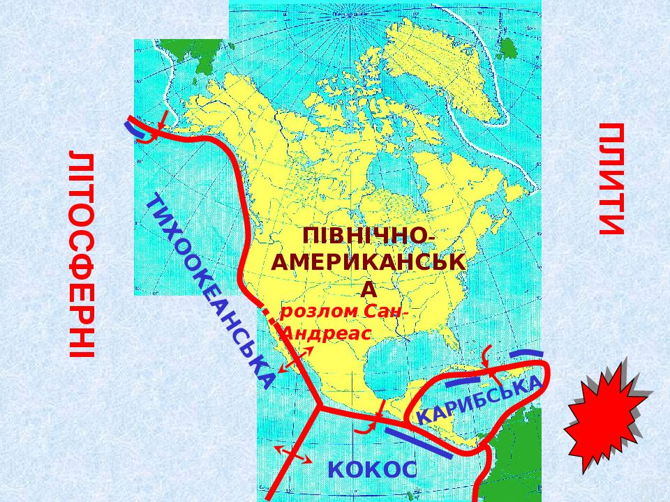 ЛІТОСФЕРНІ ПЛИТИ ПІВНІЧНО-АМЕРИКАНСЬКА ТИХООКЕАНСЬКА КОКОС КАРИБСЬКА розлом Сан-Андреас