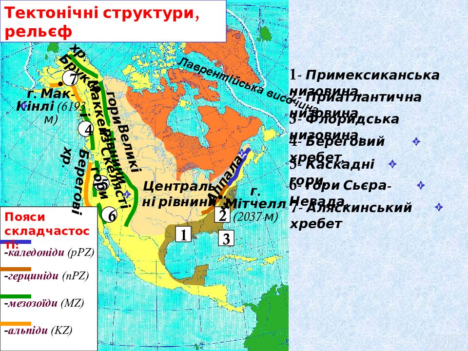 Центральні рівнини Лаврентійська височина 1 2 3 Аппалачі г. Мак- Кінлі (6193 м) хр. Брукса гори Маккензі 4 5 6 7 Скелясті гори Тектонічні структури, рельєф г. Мітчелл (2037 м) - герциніди (п PZ) - альпіди (KZ) - каледоніди (р PZ ) - мезозоїди (MZ) Пояси складчастості: Берегові хр. Великі рівнини F 1 - Примексиканська низовина, 2 - Приатлантична низовина, 3 - Флоридська низовина, 4 - Береговий хребет, 5 - Каскадні гори, 6 - гори Сьєра-Невада, 7 - Аляскинський хребет F F F F F F