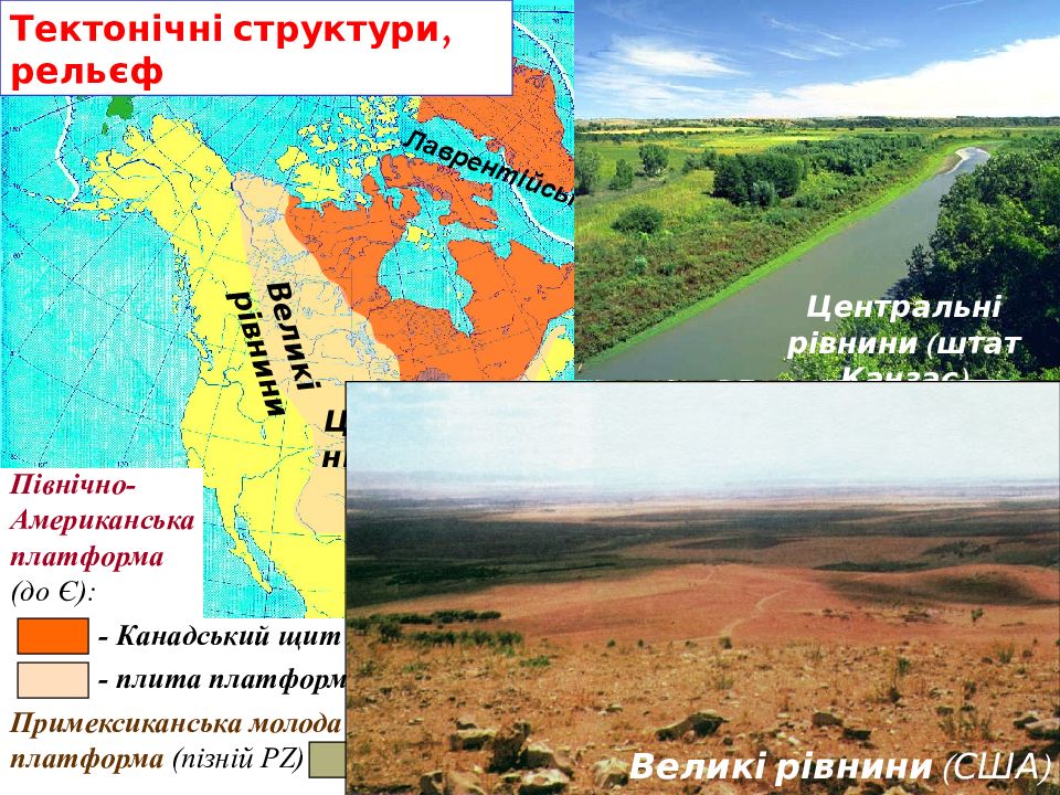 Центральні рівнини Великі рівнини Лаврентійська височина 1 2 3 1 - Примексиканська низов., 2 - Приатлантична низов., 3 - Флоридська низов., Тектонічні структури, рельєф Лаврентійська височина (Канада) Центральні рівнини (штат Канзас) Північно-Американська платформа (до Є): - плита платформи Примексиканська молода платформа (пізній PZ ) - Канадський щит Великі рівнини (США)