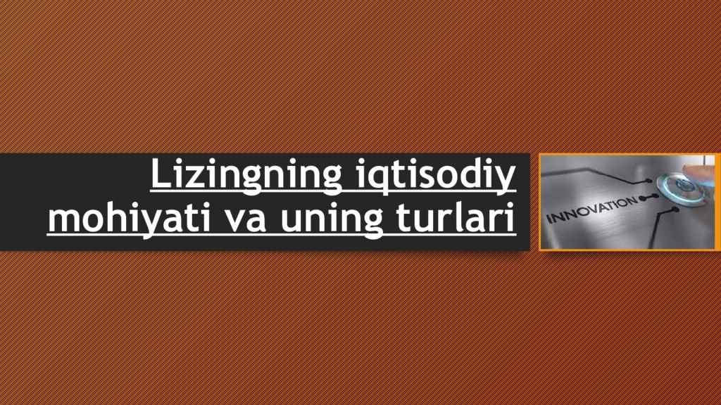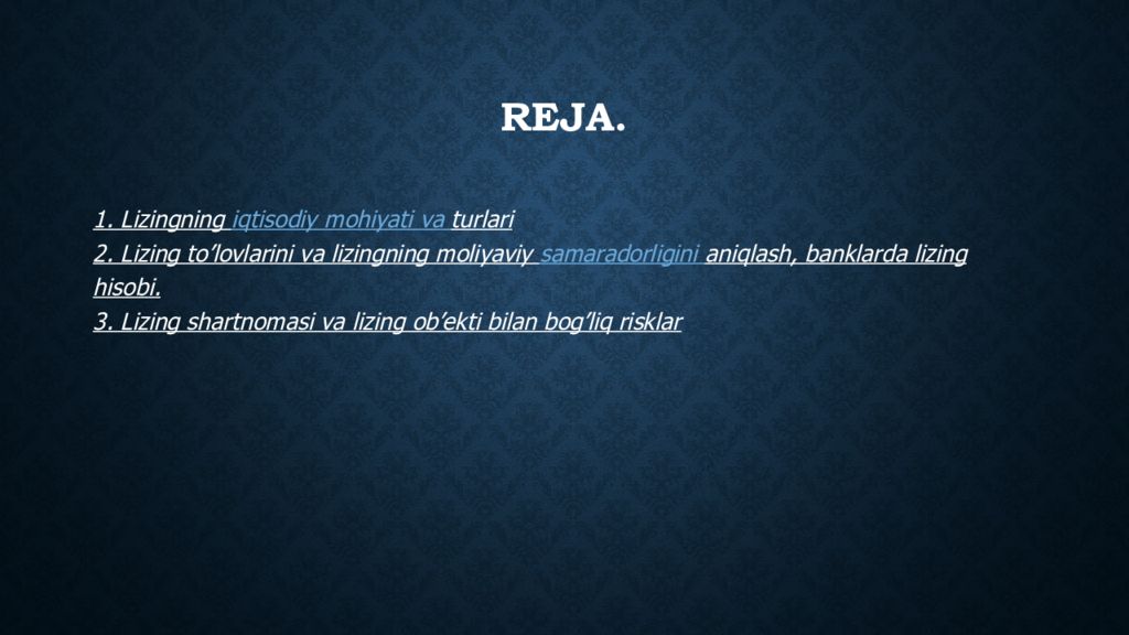1. Lizingning iqtisodiy mohiyati va turlari 2. Lizing to’lovlarini va lizingning moliyaviy samaradorligini aniqlash, banklarda lizing hisobi. 3. Lizing shartnomasi va lizing ob’ekti bilan bog’liq risklar