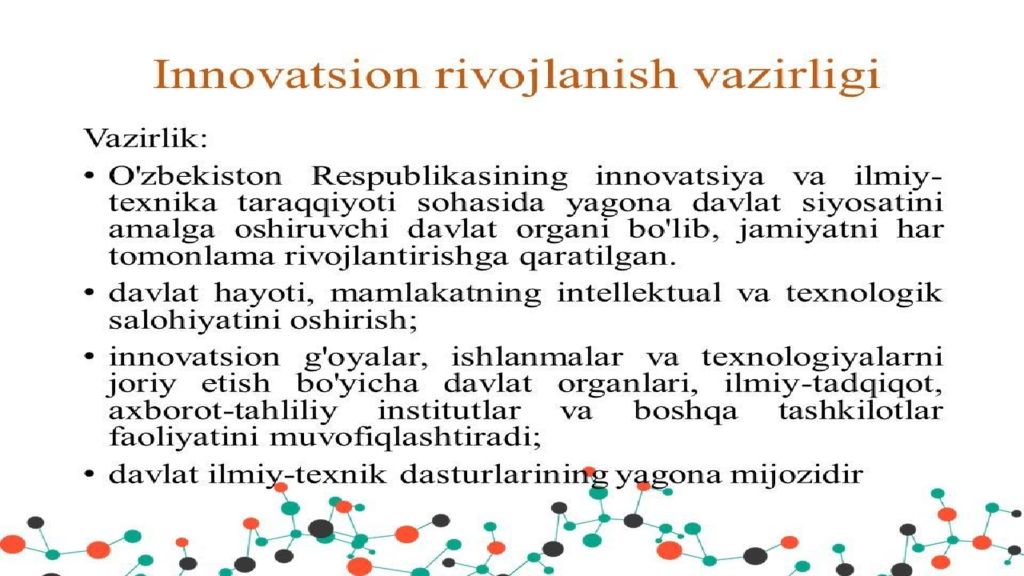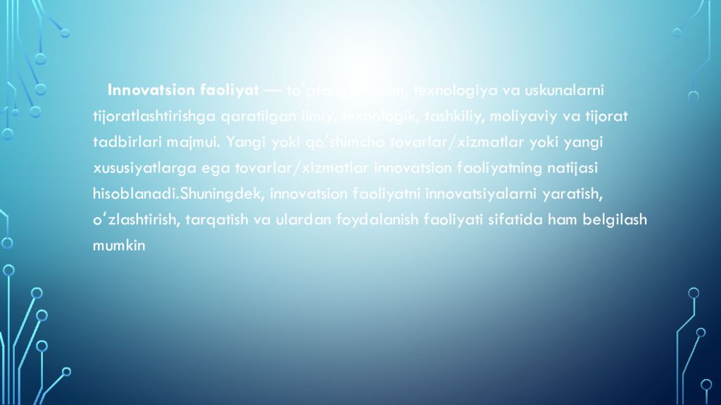 Innovatsion faoliyat — toʻplangan bilim, texnologiya va uskunalarni tijoratlashtirishga qaratilgan ilmiy, texnologik, tashkiliy, moliyaviy va tijorat tadbirlari majmui. Yangi yoki qoʻshimcha tovarlar / xizmatlar yoki yangi xususiyatlarga ega tovarlar / xizmatlar innovatsion faoliyatning natijasi hisoblanadi.Shuningdek, innovatsion faoliyatni innovatsiyalarni yaratish, oʻzlashtirish, tarqatish va ulardan foydalanish faoliyati sifatida ham belgilash mumkin